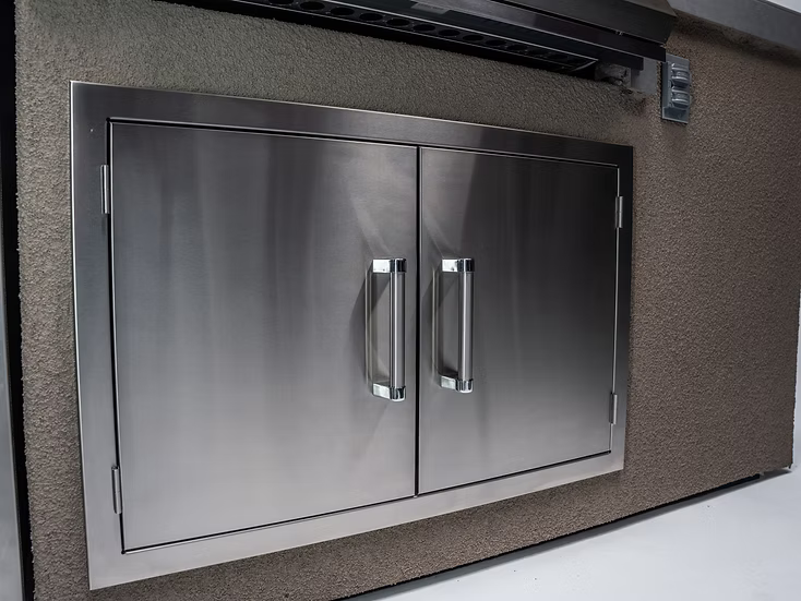 Fits perfectly in the middle of the yard or right up against a home. No seating, ideal for customers who don't want people to sit next to the kitchen. Includes large 32" KoKoMo Grill, access door, and fridge. Lifetime Warranty.