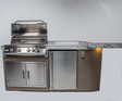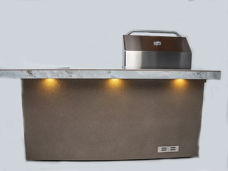 Fits perfectly in any part of the yard. Seats 6-8. With 5 LED lights, raised overhang, to give a bar type feeling. Includes 32" KoKoMo Grill, access door, fridge, and outlet. Lifetime Warranty.